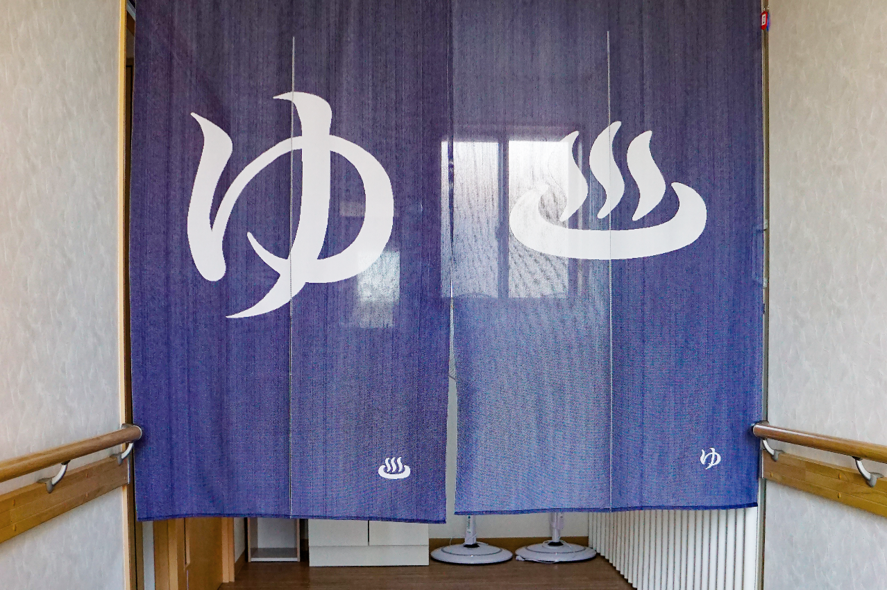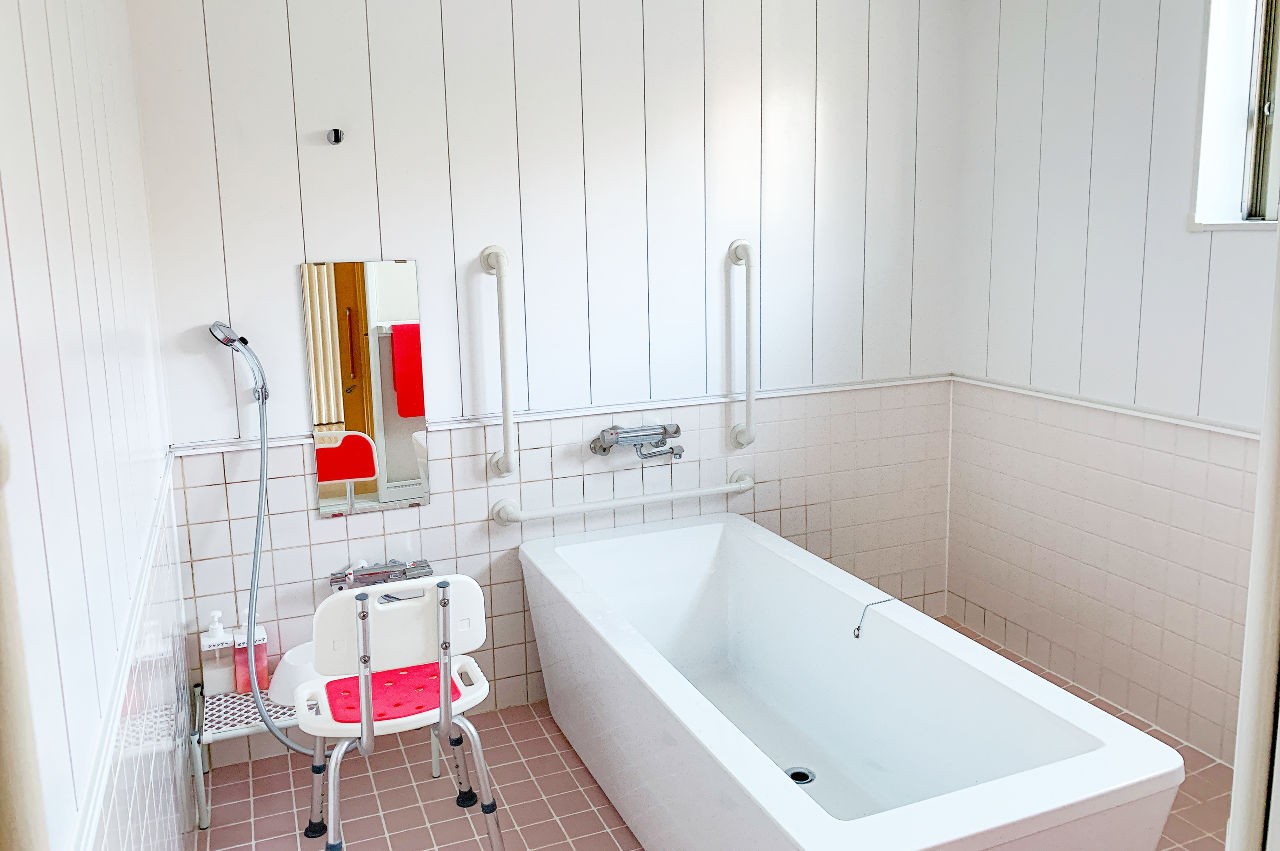 お風呂は管理棟にあります。安全に配慮した浴室です。有資格のスタッフが入浴のお手伝いを致します。
